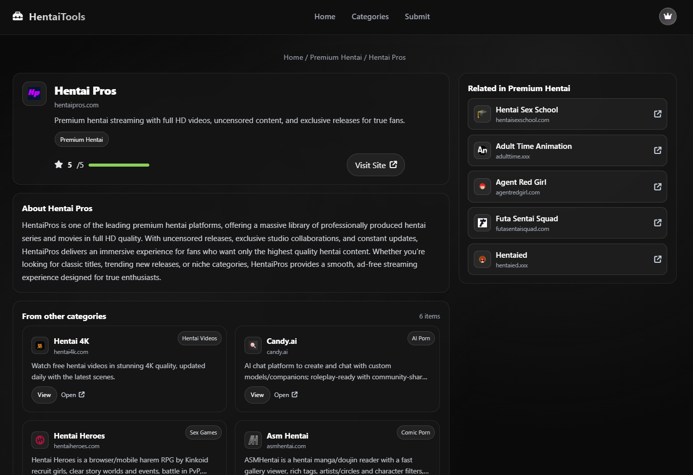 HentaiTools.com is a modern, dark-themed directory that showcases the best hentai sites on the web. All listings are hand-picked, ensuring only quality, verified sources make the cut. With its focused scope and clean design, it’s a go-to destination for hentai enthusiasts looking for curated recommendations without clutter or spam.