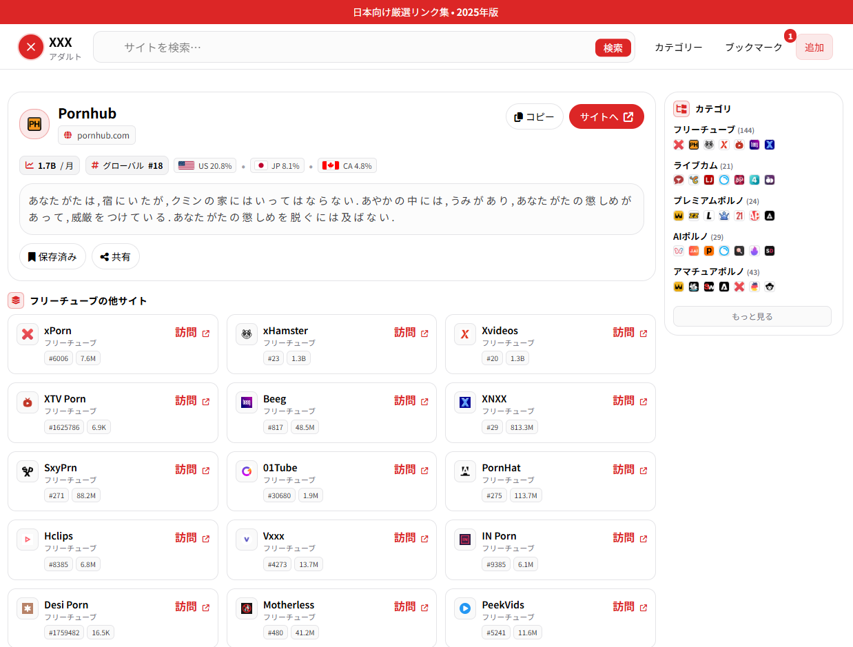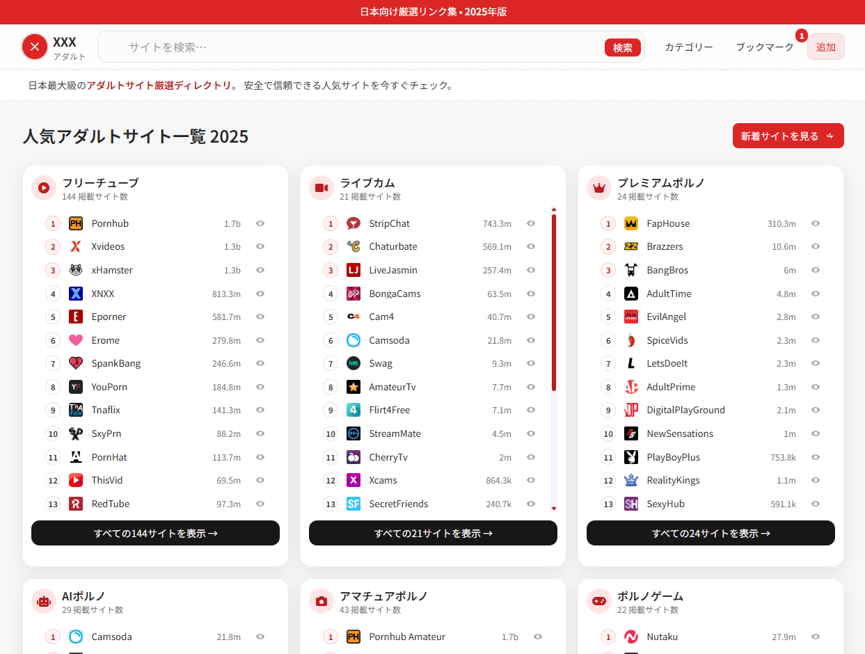 A Japan-focused adult site directory with a clean design, native interface, and solid curation perfect for local users looking to discover top porn sites.
